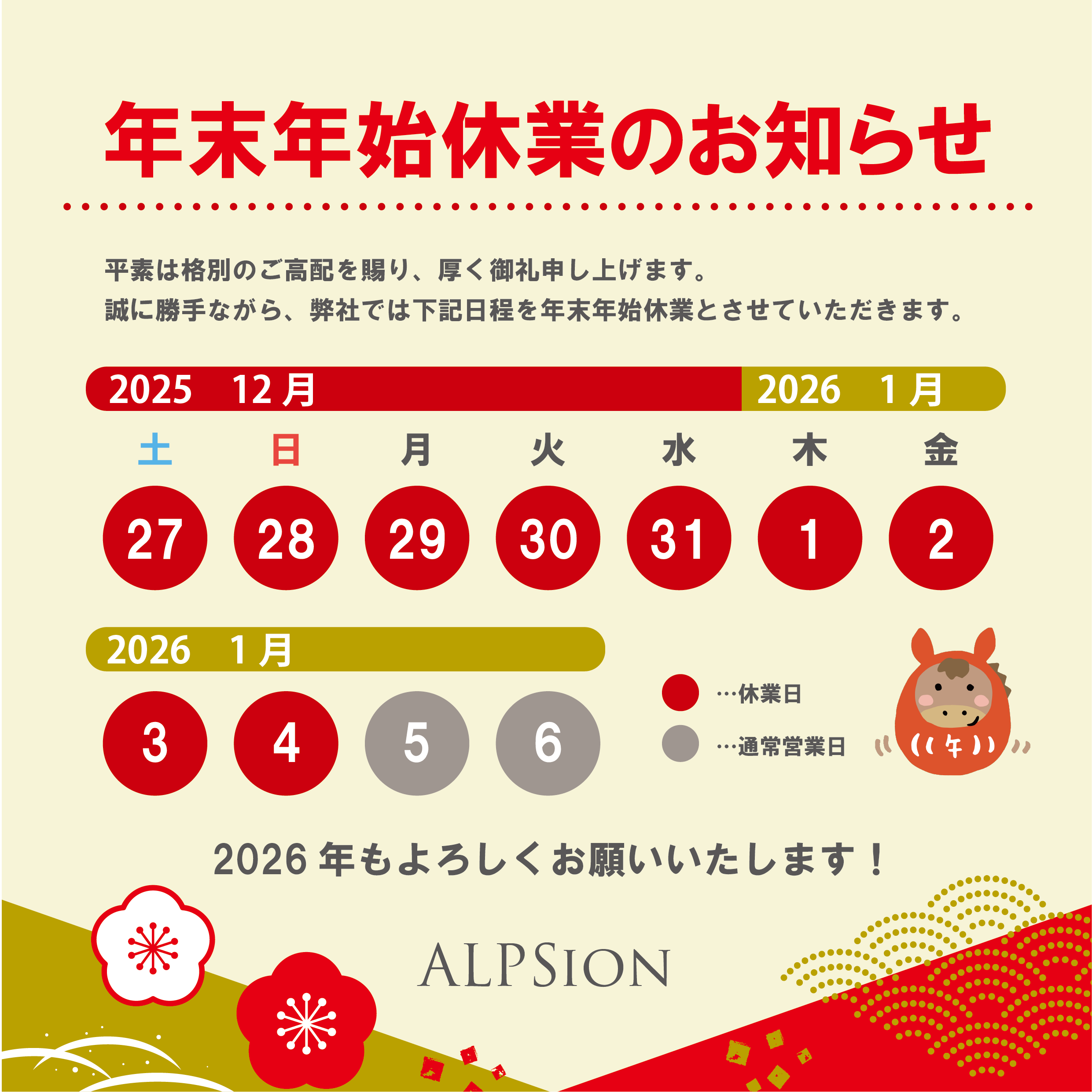 【休業期間】2025年 12月27日(土)~2026年 1月4日(日)